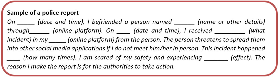 你可以通过线上,或前往马来西亚通讯与多媒体委员(Malaysian Communications and Multimedia Commission, MCMC) 的办事处提出投诉。在你提出投诉后,你将收到投诉编号。你可以先报警,再将报案纸连同相关投诉呈交给MCMC,好让相关单位进行调查,以及采取必要的行动。你也可以联系 Cyber999。